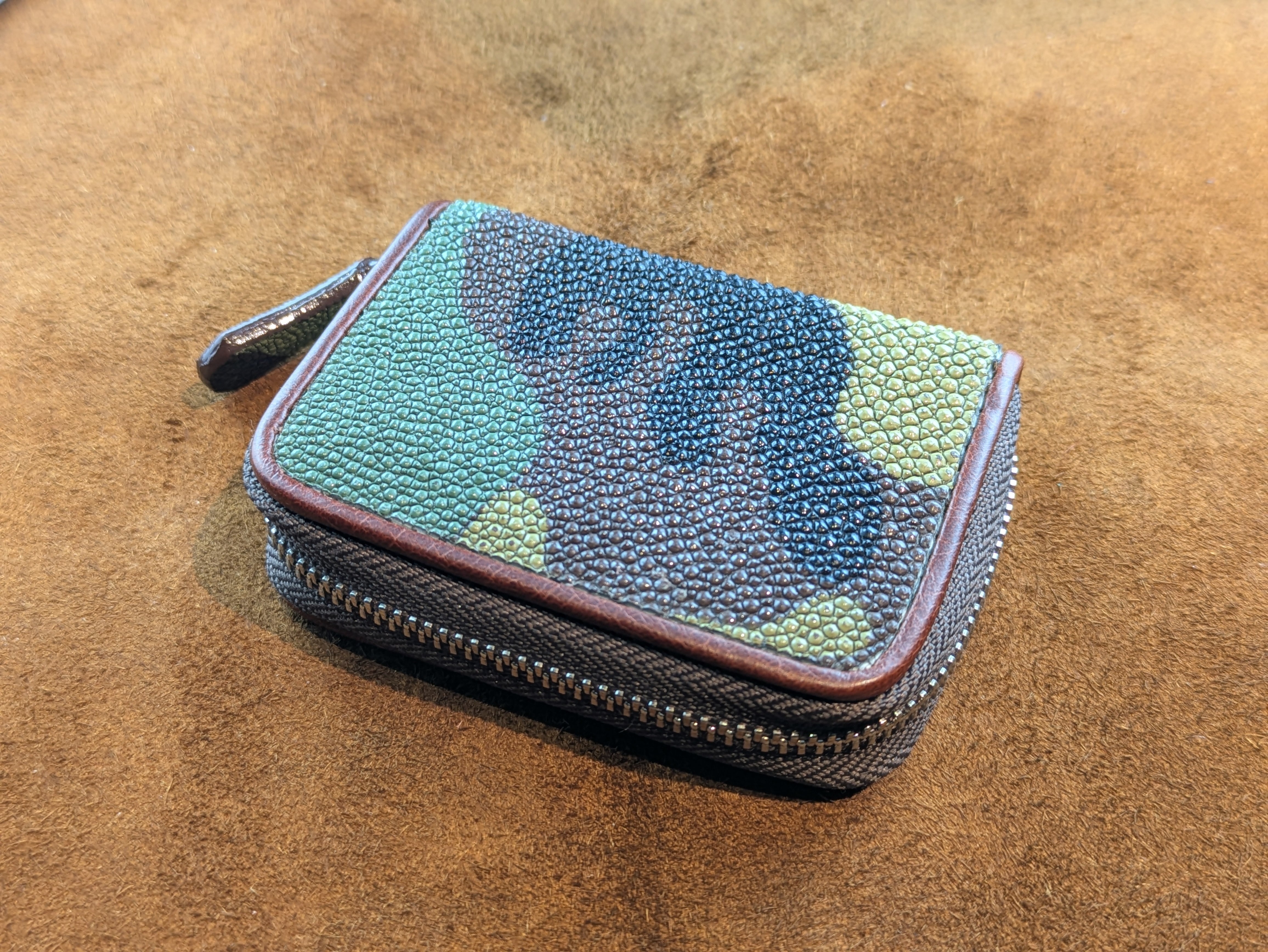 唯一無二の輝きと耐久性を兼ね備えたエイ革を使用した逸品です。