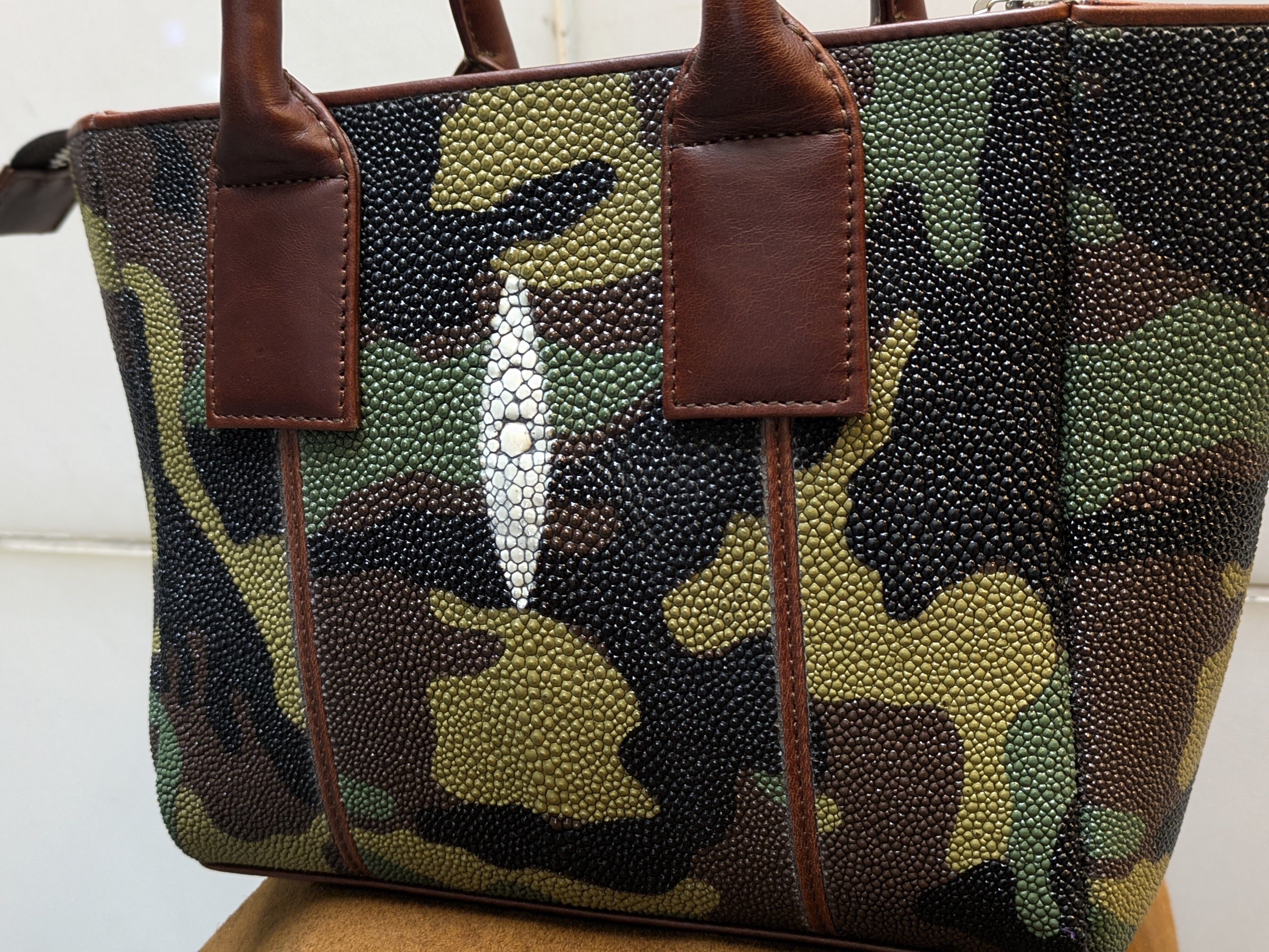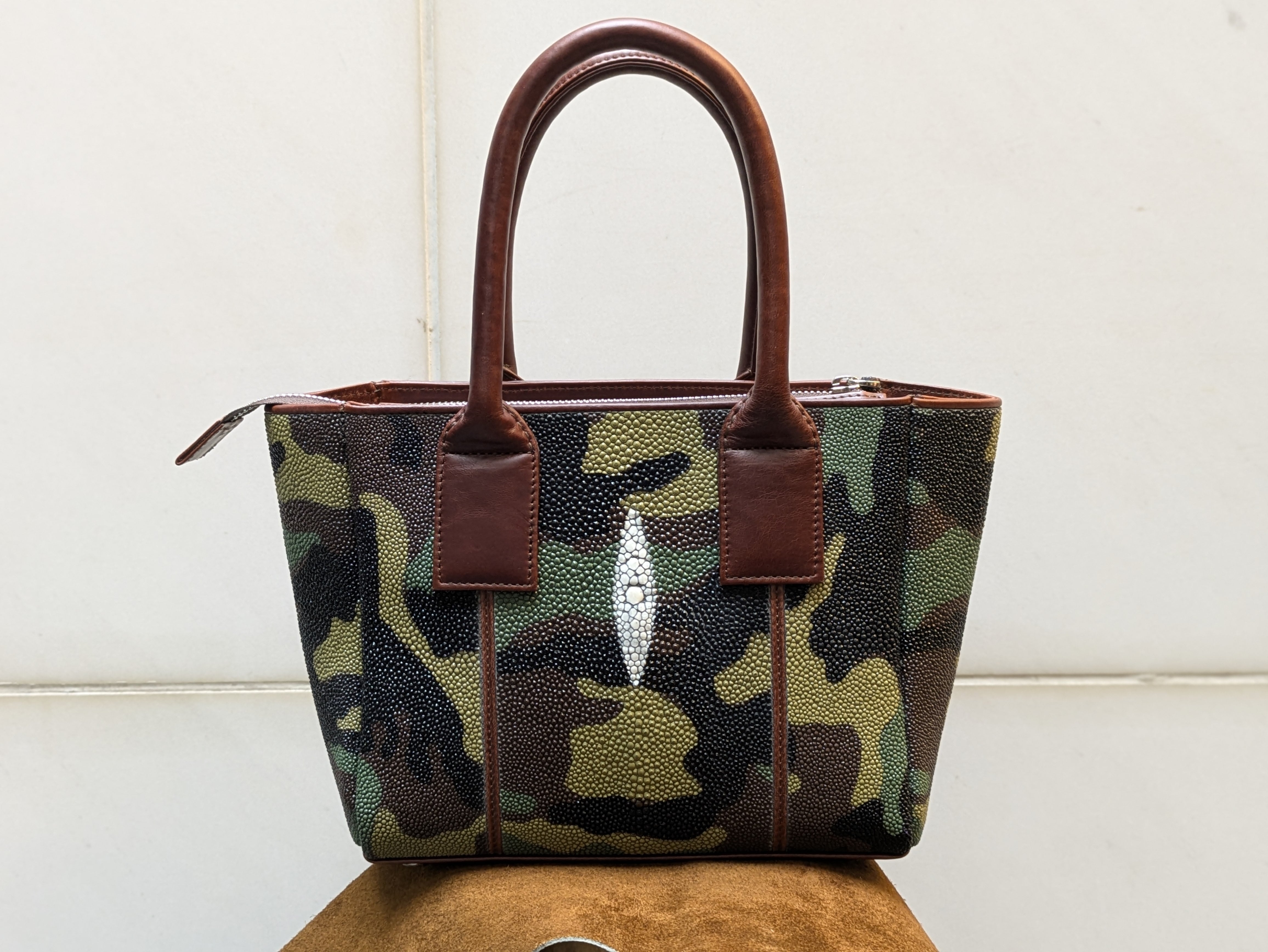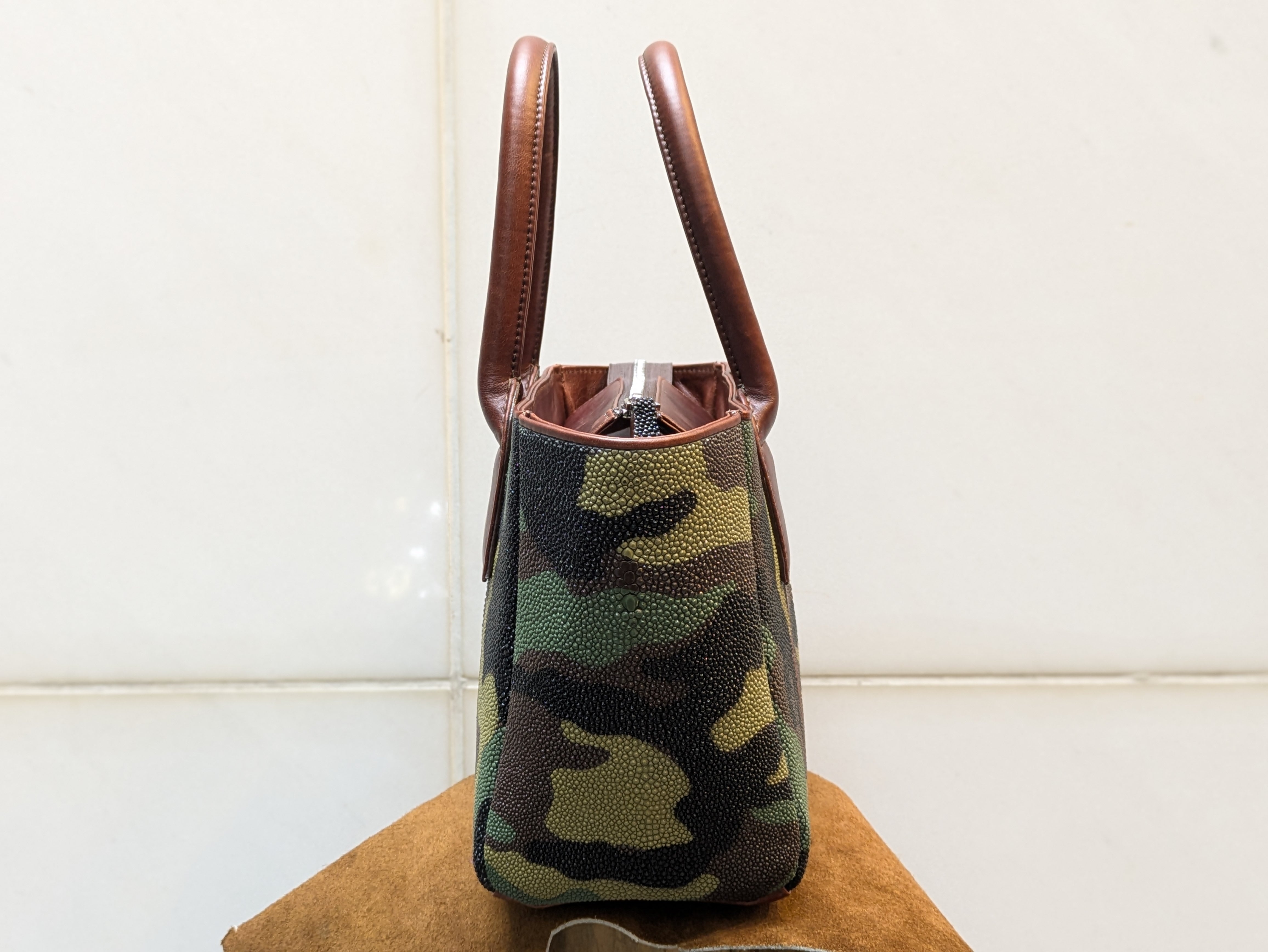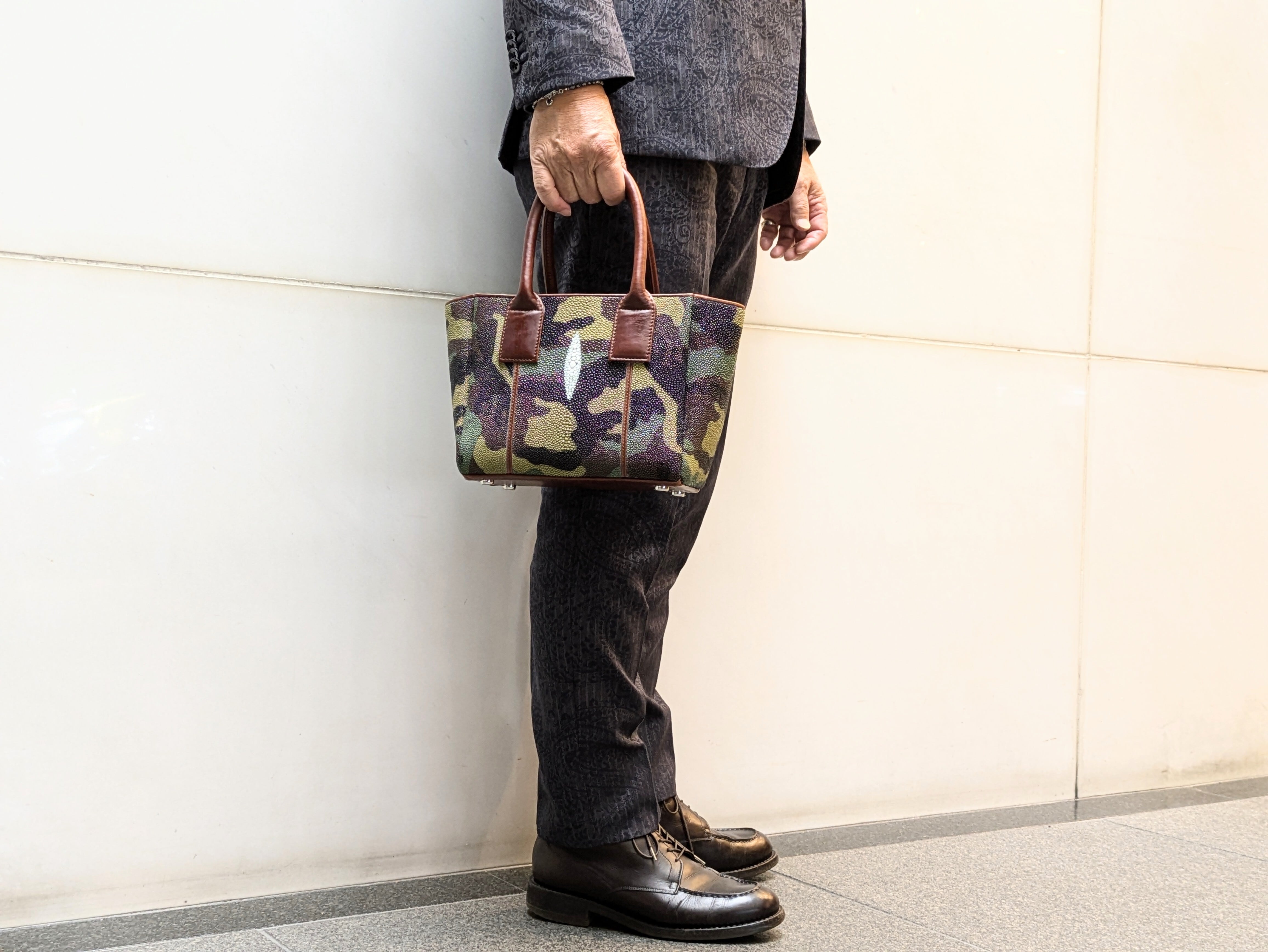 "海の宝石"と言われるガルーシャ(エイ革)を贅沢に使用した小さめレクタンバックです。